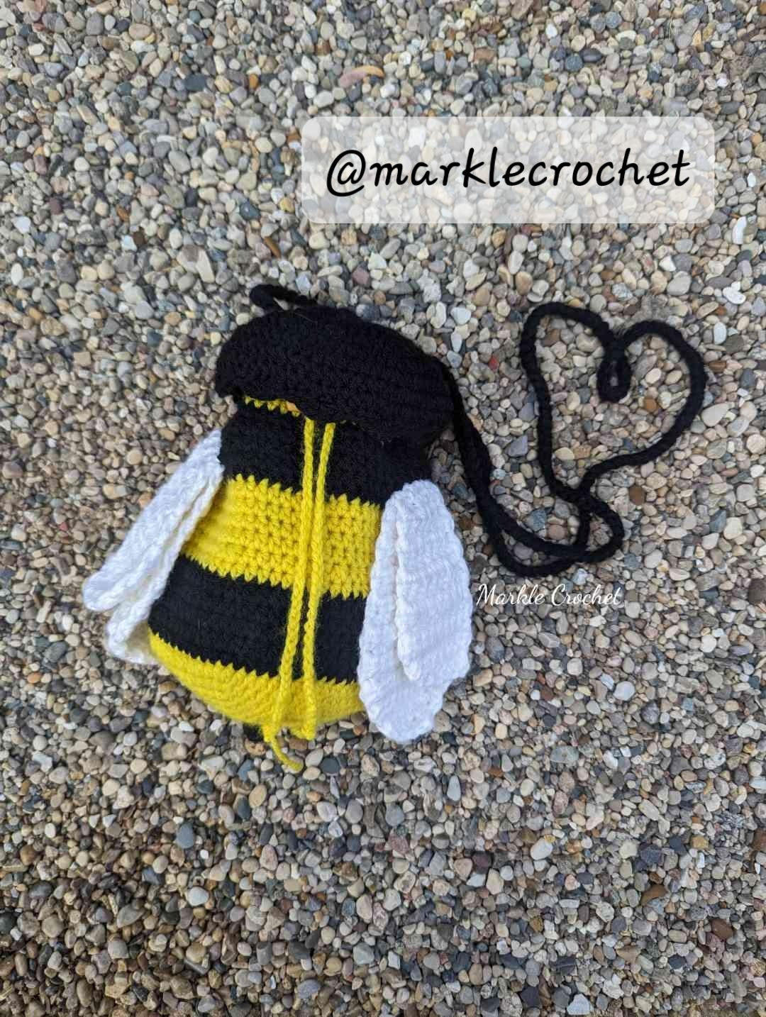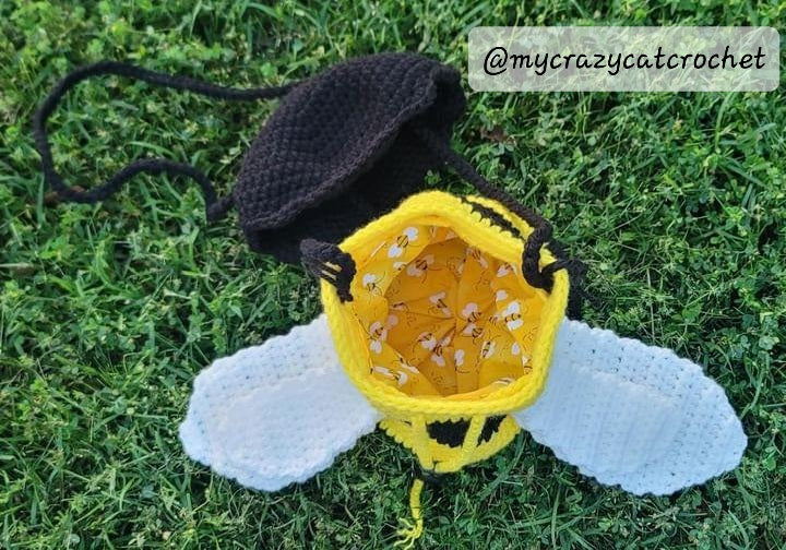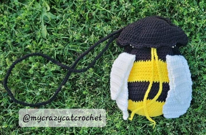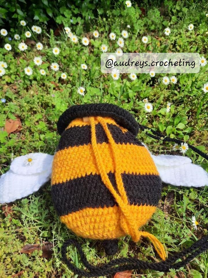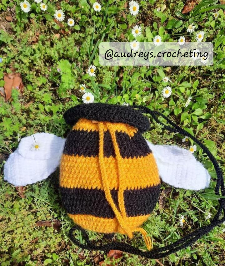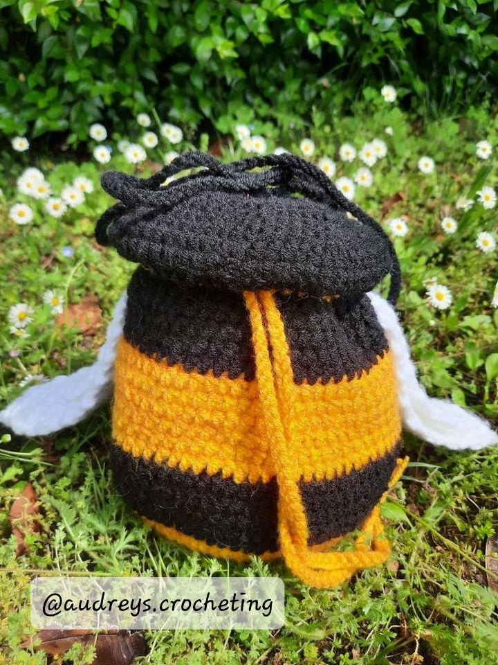 Approx. yardage: 100 yards for colour A (Body, Drawstring), 180 yards for colour B (Body, Head, Stinger and Strap), 80 yards for colour C (Wings)